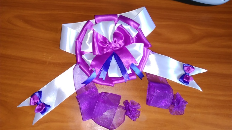 Осенило меня вчера, что хоть я нарядом на выписку и не заморачиваюсь особо, но пеленку или пледик надо же будет чем-то перевязать)) Из того, что было дома вышла вот такая штучка. Ленту сделала подвижную относительно банта, сиреневая для обмотки, а белая для красоты)