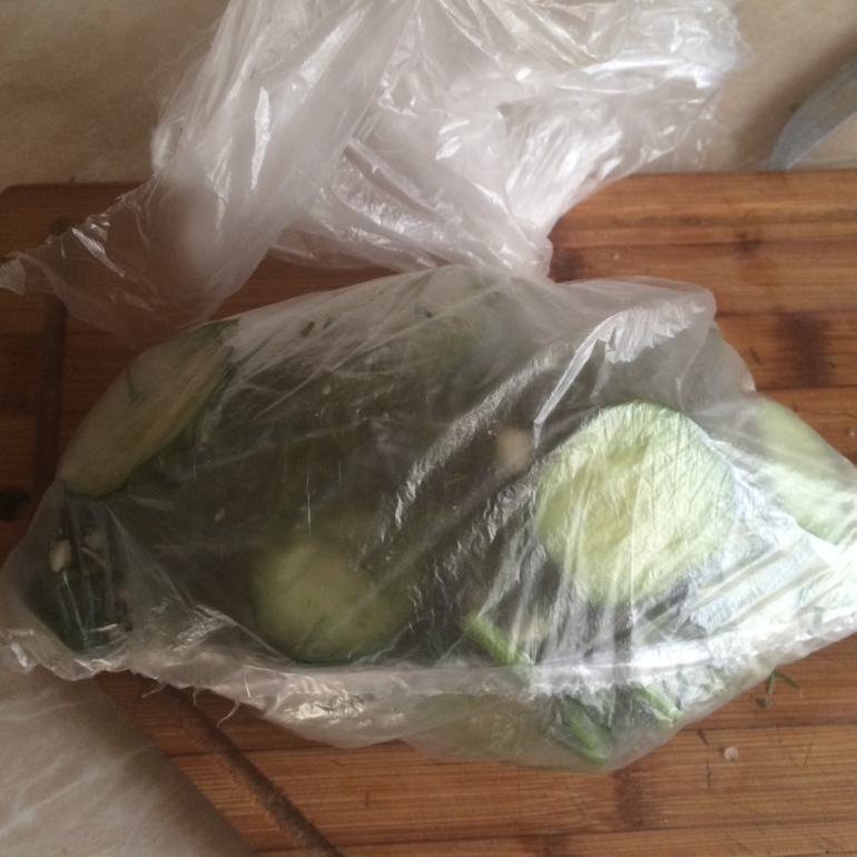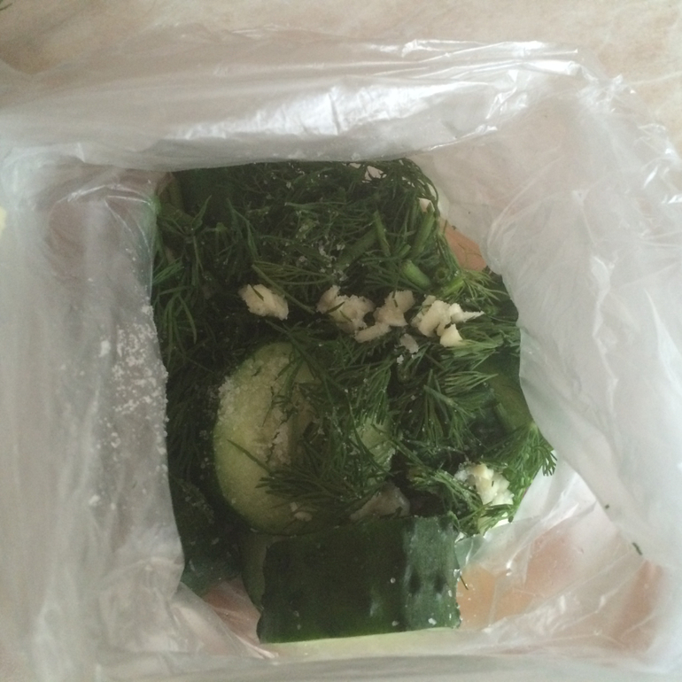 2 огурца - порезала кусками, 2 зубчика чеснока (порубила), 5 веточек свежего укропа, 0,5 ч.л. соли (без горки). 2 пакета.
