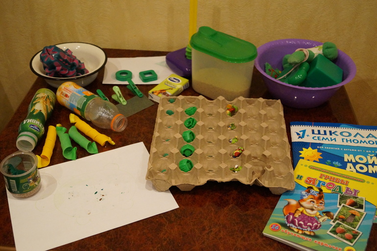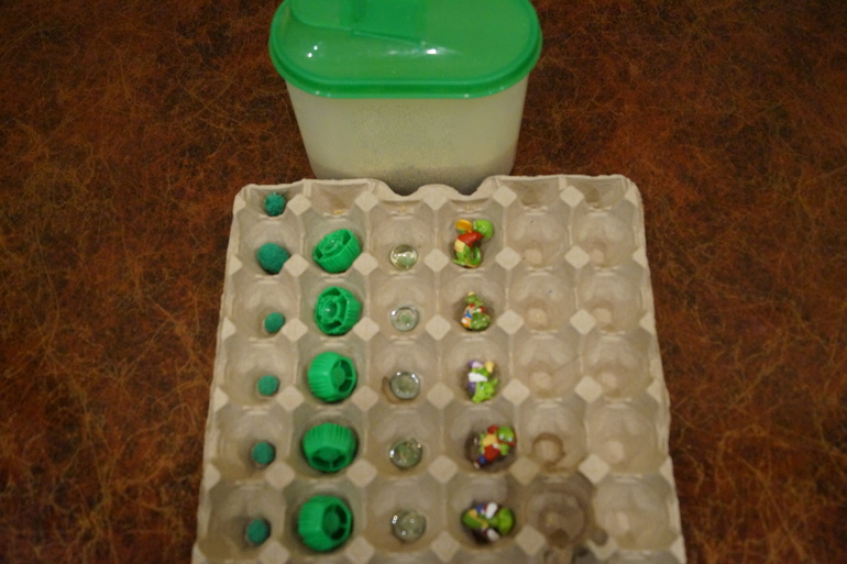 Ну и, конечно, мы поковырялись в сенсорной баночке с зеленой крышкой. Вытащили оттуда зеленые предметы, завернутые в фольгу, и разложили их по домикам. Причем я старалась помочь ей, чтобы одинаковые предметы лежали в один ряд. У нас были помпоны, зеленые камушки, зеленые игрушки из киндера, фрутокрышки.