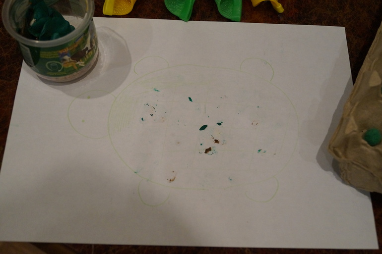 Творческим заданием сегодня стала наша черепаха. Я ее нарисовала, налепили пластилин. Кате надо было доделать панцирь - воткнуть в пластилин гречку. Но игра приняла другой оборот. Катерина решила снять пластилин с черепахи. Поскольку он был налеплен небольшими кусочками, дочь быстро справилась. Я решила не вмешиваться.