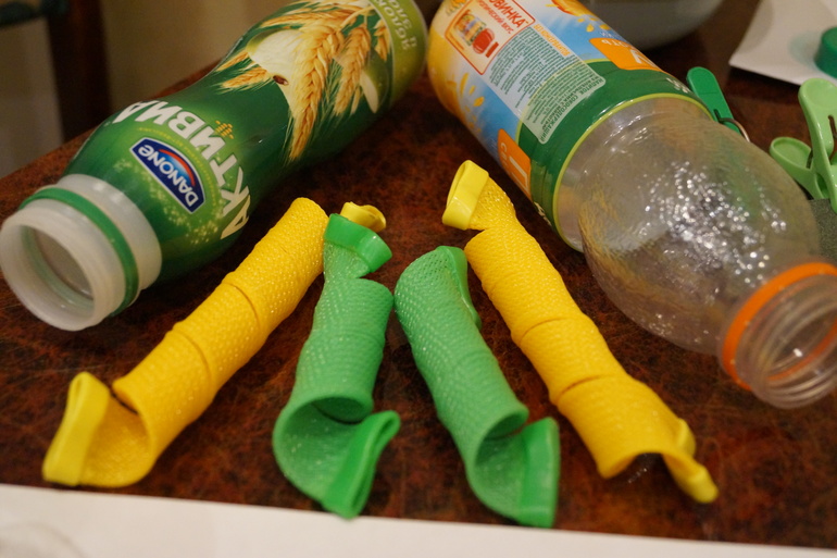 Затем настало время сортировки. В этот раз я заменила помпоны бигудями. Нужно было положить зеленые в зеленую бутылку, желтые - в оранжевую (желтой дома не нашлось). Это задание понравилось больше. Видимо, дочь просто устала от помпонов.