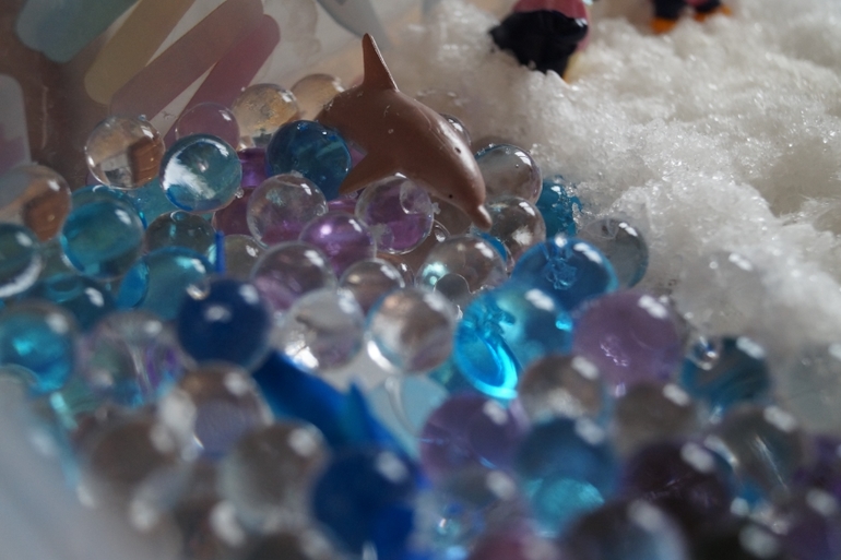 В конце я дала сенсорную коробку. В воде из гидрогеля живут морские обитатели, которых Катя видела впервые. А по снежку из памперса топчутся пингвины. Дочери больше всего понравились новые фигурки, а также ее забавляло показывать, как идет снег. Надо было придумать какую-нибудь историю, но хорошая мысля, как известно, приходит слишком поздно.
