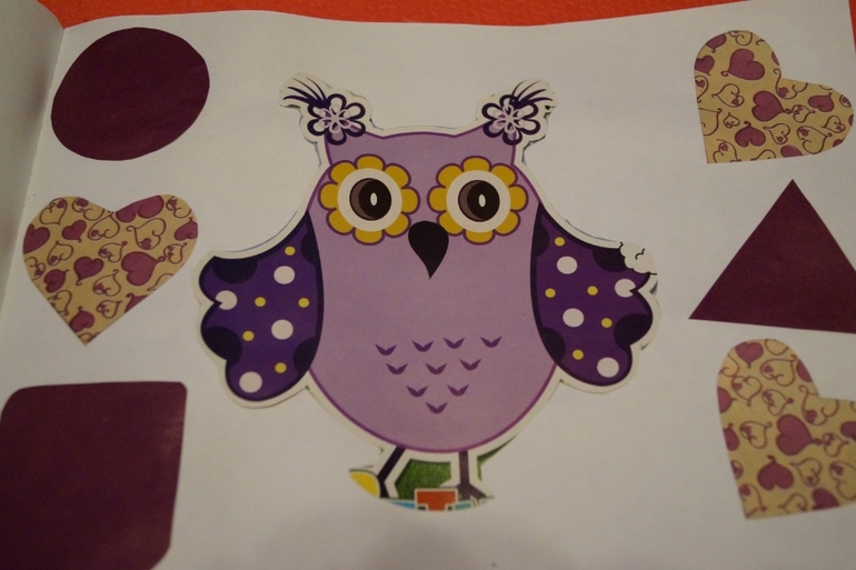 В этот день мы очень много клеили. Сначала нашли все фиолетовые наклейки, потом с помощью клея-карандаша фиолетовую сову и геометрические фигуры. Вместо комканой бумаги мы взяли сначала помпоны и разложили в форме винограда, а потом налепили ягодки из пластилина и прикрепили к бумаге.