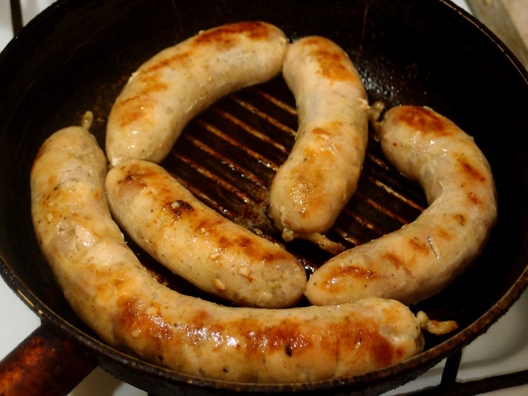 Натуральную оболочку замачиваем в теплой воде и хорошо промываем от соли. Наполняем оболочку фаршем, завязываем по краям, прокалываем в нескольких местах иголкой. Форму для запекания смазываем растительным маслом, выкладываем колбасу и отправляем разогретую до 180 градусов. Запекать в течении часа.