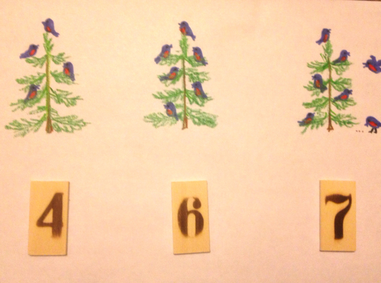 Тренируем счет. Считаем птичек на елке и подбираем цифру.