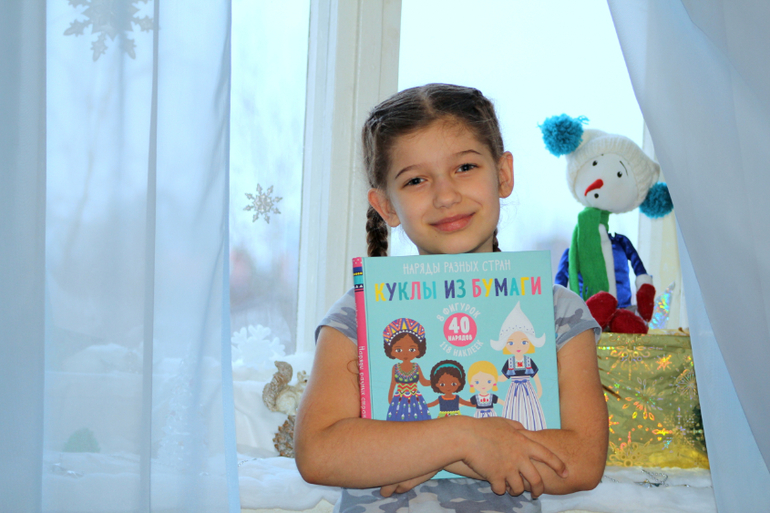 В книге вы найдёте восемь куколок из очень плотного картона. Четыре мамочки у каждой по дочке.)) Все куклы разных национальностей. Так их удобнее переодевать. Нарядов в книге огромное количество и все они представляют национальную одежду разных стран. Продумана каждая мелочь! Для кукол есть подставочки, их не нужно придерживать, чтобы играть! У нас они водят хоровод вокруг ёлочки, а Настёна переодевает их каждый день в новые костюмы, бывает и несколько раз в день куколки меняют одежду.)) Вместе с нарядом куклы меняют и свои имена и национальность. В книге написаны имена и немного информации о том, куда собралась девочка с мамой, зачем они одели такой наряд. И даже когда все одёжки будут вынуты из книги и храниться будут в коробочке, или конвертике, можно не переживать, что не сможете запомнить какой наряд к какой стране принадлежит. В самом конце книги есть карта с названием стран и нарисованным нарядом! Отличное, продуманное решение издательства! Настёна ещё радуется наклейкам.)) А как же! Куклам можно и сумку в руки дать, и украсить серьгами и браслетами! Одним словом красотища! Мечта любой девочки!