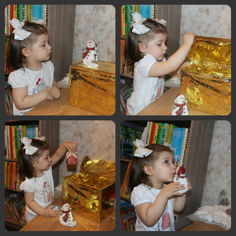 Сундучок этот я сделала довольно быстро из простой почтовой коробки, упаковочной бумаги, скотча и немного тесьмы для украшения. Насте тогда только-только исполнилось два годика. Она ужасно стеснялась рассказывать стихи. Только меня удостаивала этой чести.)) Вот я и решила совместить приятное с полезным. Дочка должна была рассказывать стихи Снеговику, а он приносил ей подарочки. Ох, сколько раз в день нетерпеливый ребёнок заглядывал в волшебный сундучок! 😅 Никакие увещевания, что Снеговик подарки приносит только ночью, когда все спят, не помогали. Но мой план сработал! Настя стала читать стих Снеговику сначала робко, потом все смелее, потом уже могла прочесть стих при брате, а в Новый год вовсю рассказывала стихотворение при всей семье! Ура!))