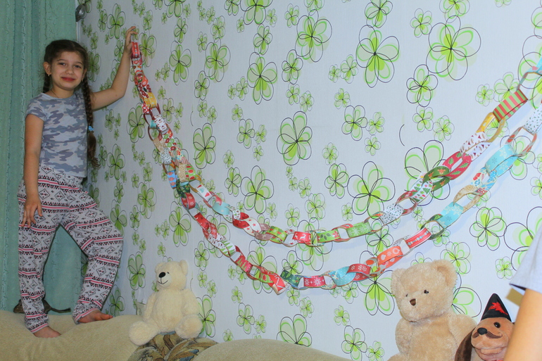 Я весь день занималась своими делами и меня никто не дёргал каждые пять минут! Мамочки знают как это ценно! Но чем же был занят мой младший ребёнок? Она весь день делала обалденную, гигантскую гирлянду для украшения дома! Просто прелесть! Мы ее растянули по всей комнате, смотрится отлично! Но Настёне мало! Она грустит, что у нее только одна такая тетрадь, а ей хочется сделать гирлянду такого размера, чтобы растянуть по всему периметру квартиры!)))