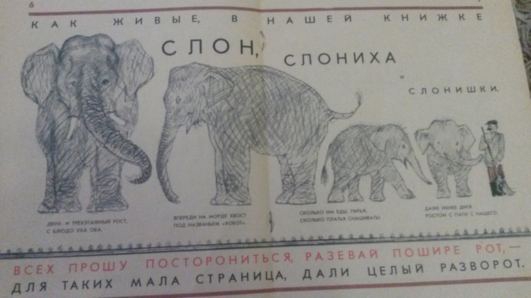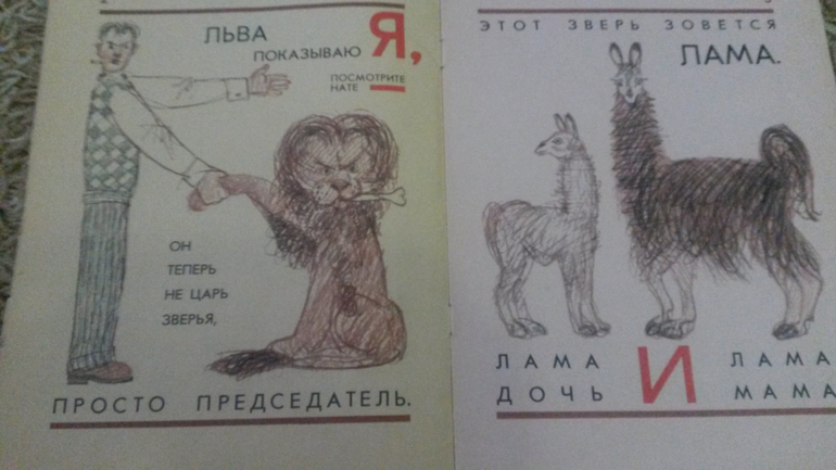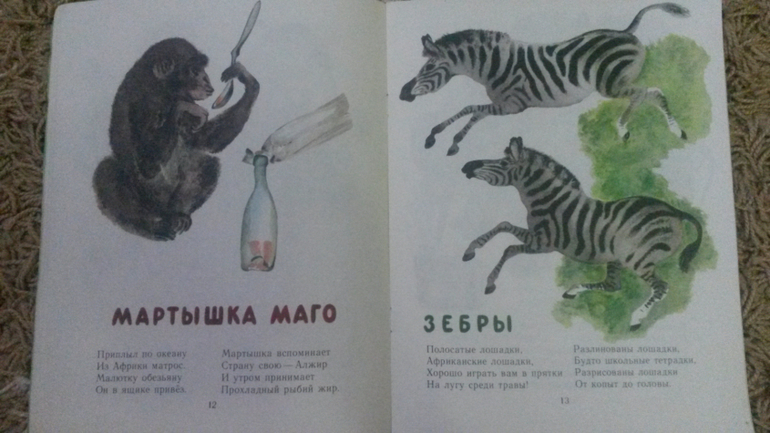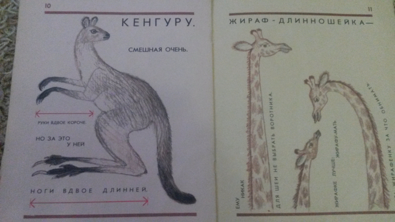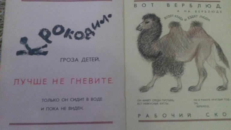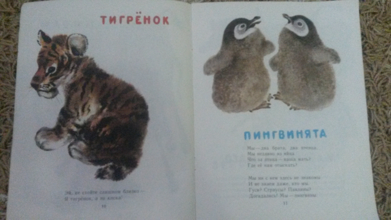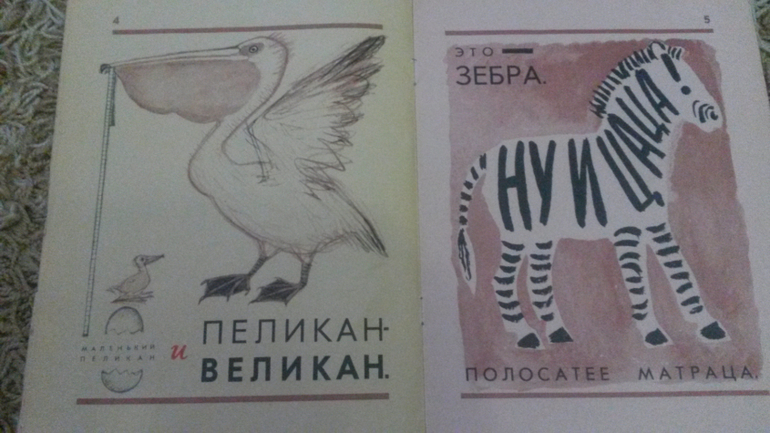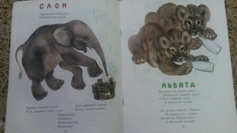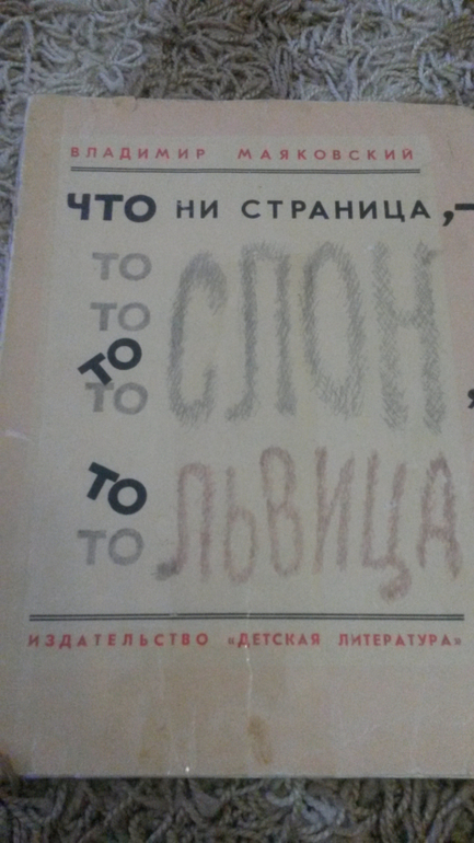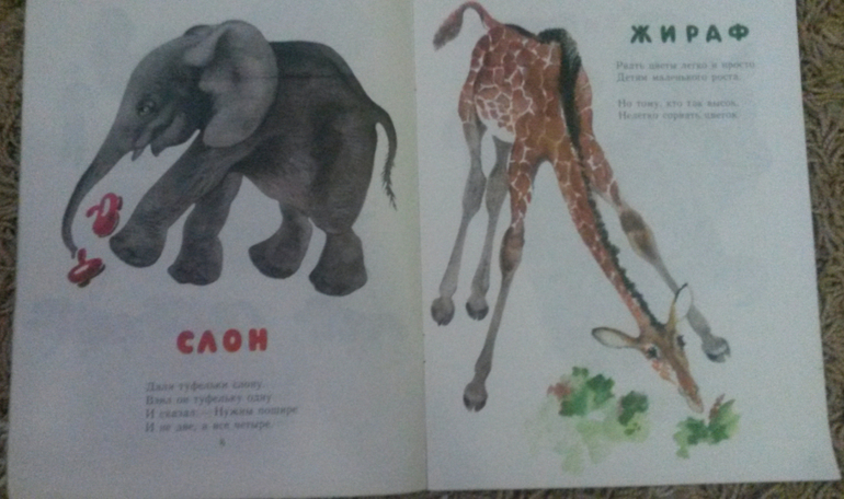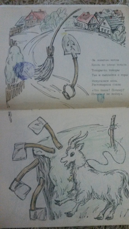 А эта книжка с коричнево-черно-серыми рисунками В.Гусева Лере больше нравится,чем предыдущие две книги.Книжка Маяковского досталась от мужа.Честно говоря,мне книжка тоже понравилась с её оригинальными рисунками.Книжка в какой-то степени мне напоминает учебник для малышей с обучение таких понятий как "большое и маленькое","короткое и длинное".