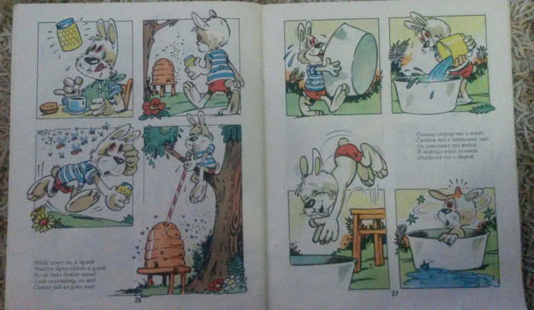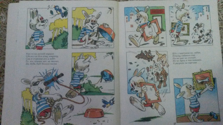 А это наш ХИТ!!!!Смешные истории про зайца Зупи. На каждой странице одна история,а таких историй очень много.К картинкам идут стихи,но они переводные с болгарского и тяжелы для слуха,нерифмованные. Поэтому мне приходится самой рассказывать по картинкам. Доча заставляет читать эту книгу от корки до корки, под конец у меня уже язык отваливается)))
