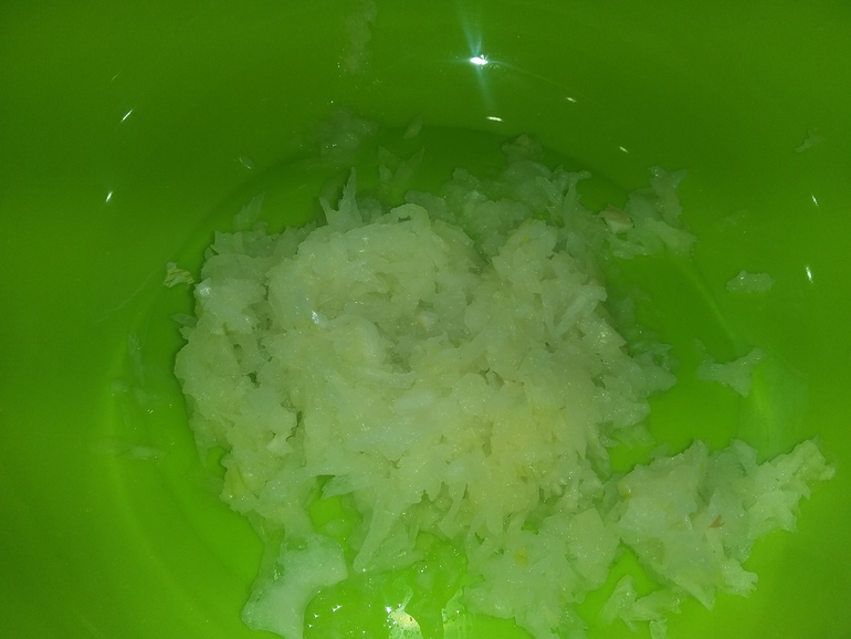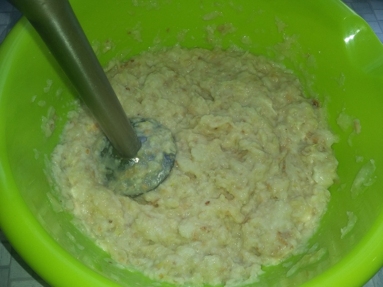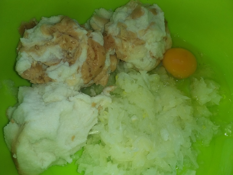 Добавить 2 отжатых булочки, замоченных в молоке и1 яйцо: