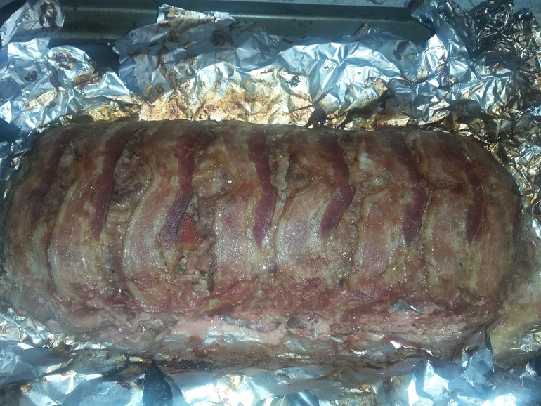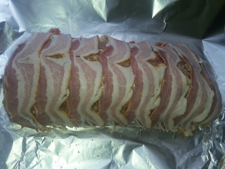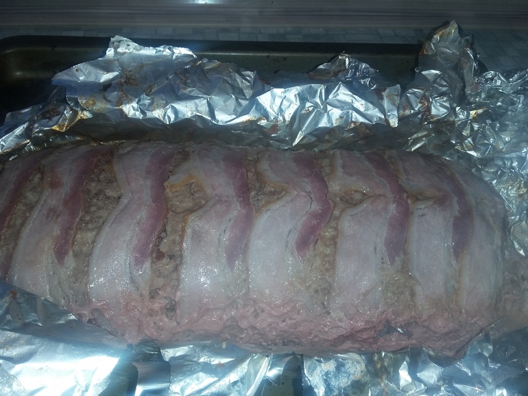 Запекать в духовке при 180 градусах полтора часа. Можно за 10 минут до конца готовки снять сверху фольгу для красивой беконной корочки: