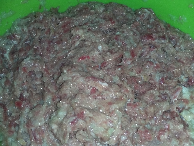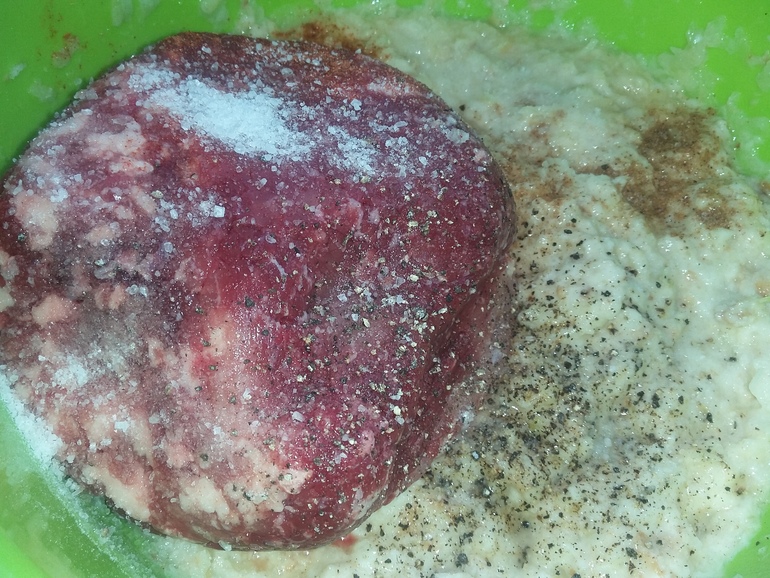 Добавить 0,7 кг фарша, соль, черный перец, паприку, мускатный орех: