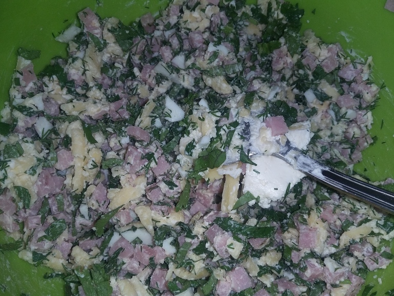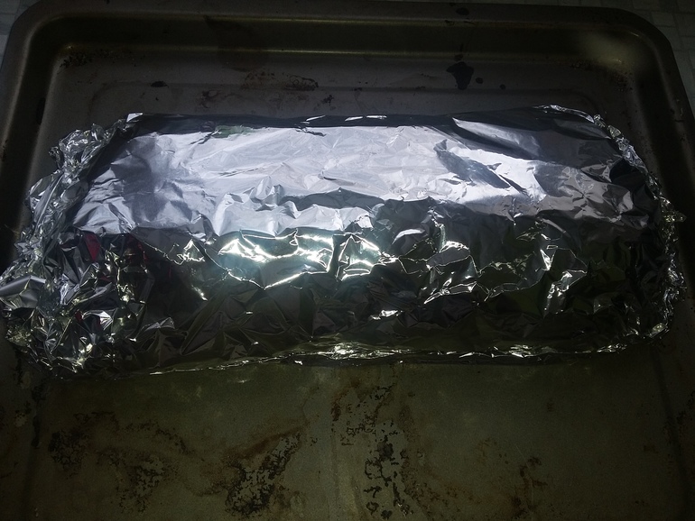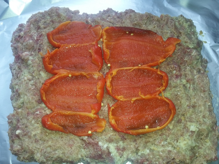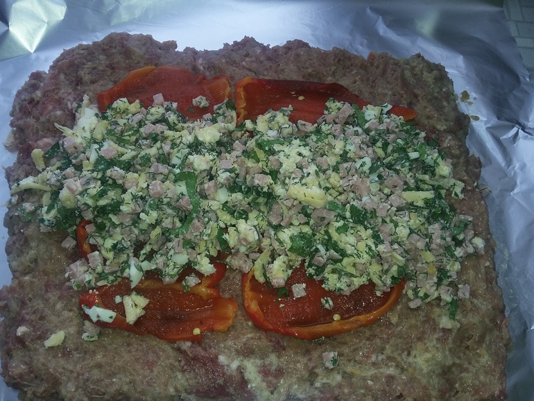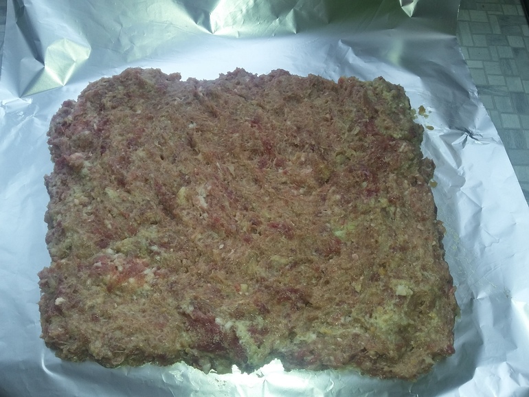Выложить на фольгу пласт из фарша (ровным слоем):