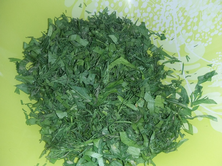 Измельчить зелень укропа, петрушки, кинзы, базилика:
