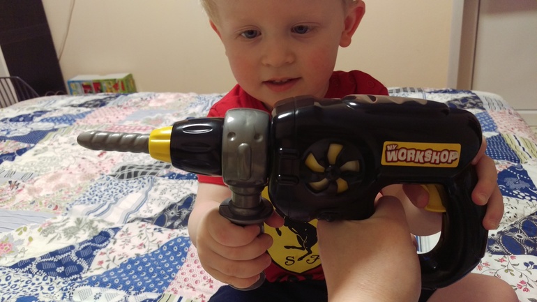 Моему на 2 года тоже в числе прочего набор инструментов с шуруповертом подарили) это хит! Ходит, везде сверлит)))