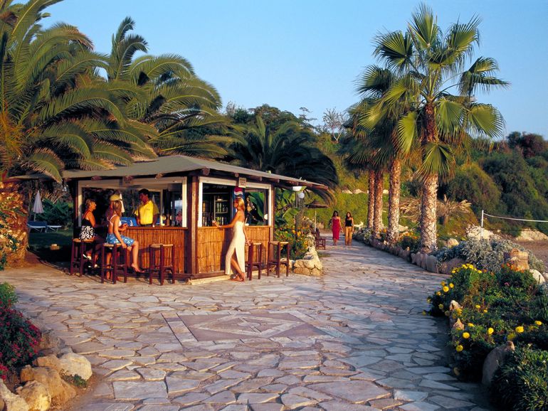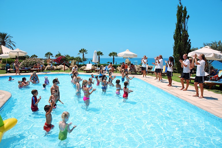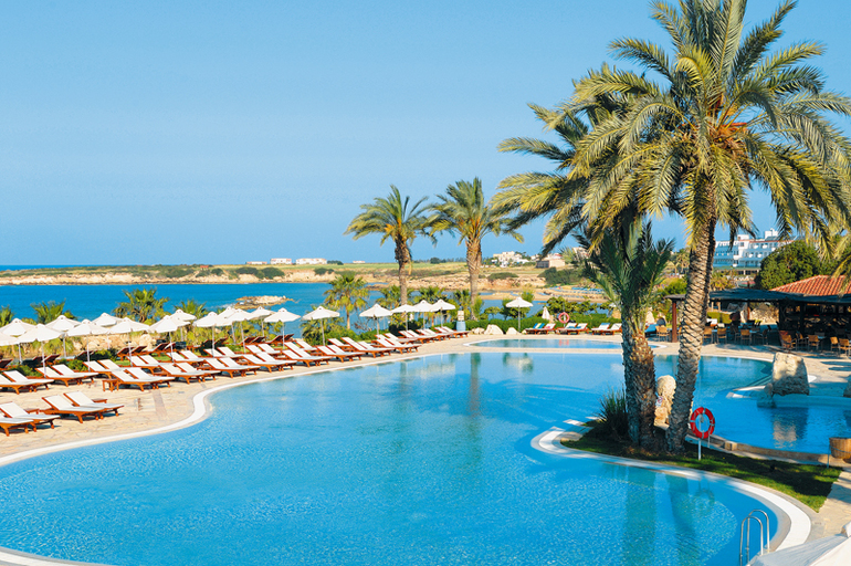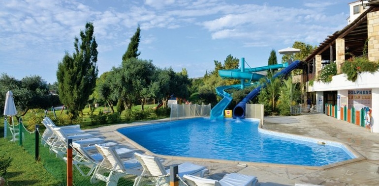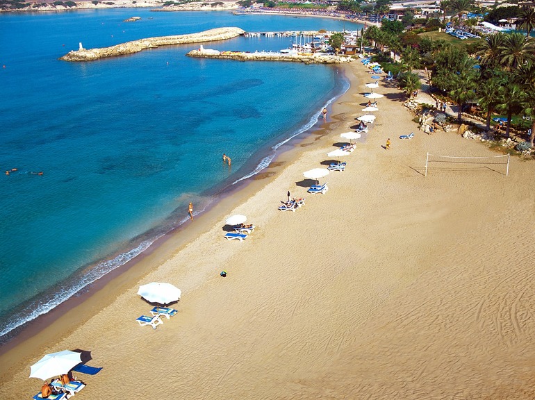 Расположен в 25 км от аэропорта Пафоса и в 15 км от центра города. Отель предназначен, в первую очередь, именно для семейного отдыха с детьми. Возле отеля хороший песчаный пляж с пологим заходом в море, удобный для деток. Шезлонги и зонты на пляже предоставляются бесплатно!