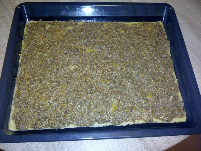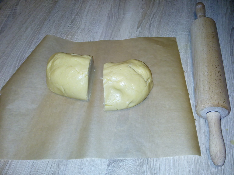после этого разделить на две части и одну раскатать на пекарской бумаге, вырезанной по размеру вашего противня.