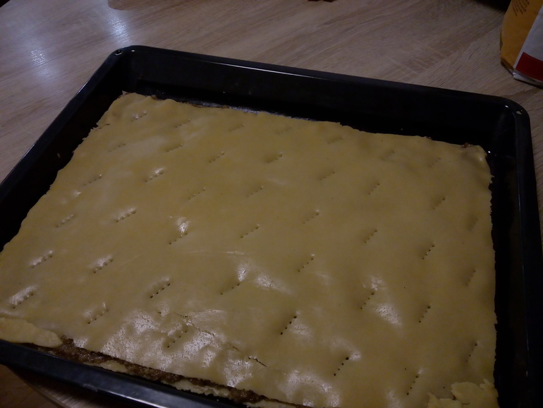 сверху накрыть ещё одним пластом теста, который надо раскатать из второй части. Края защипывать не надо...а только сверху наколоть вилкой в нескольких местах.