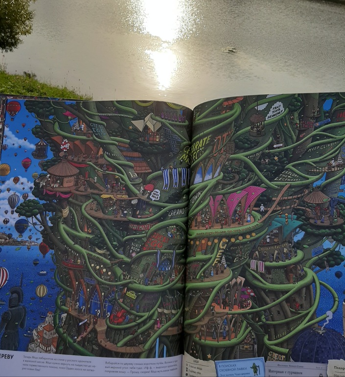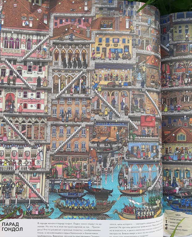 Мой ребенок с удовольствием составляет компанию этой парочке и ищет проходы, легкие пути, карнавальные купоны, маски, мишек, детей, и даже незнакомок в желтых шляпках🙈 но больше всего его, конечно впечатлил разворот с гонками и болидами👍