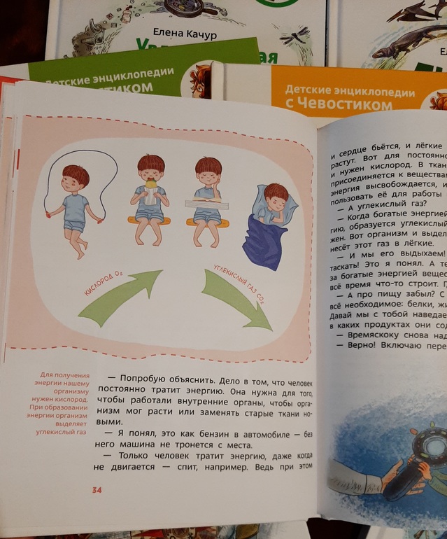 Рассказывается о работе сердца, про большой и малый круг кровообращения, зачем нужен кислород, почему образовывается углекислый газ и куда он потом девается. Про правильное питание, мускулы, бережное отношение к зубам и устройство глаза. Очень мне понравилось, что в книге уделено внимание здоровому образу жизни, без нотаций объясняется необходимость движения, свежего воздуха, правильного питания и ухода за своим телом, зубами и глазами. Чевостик то удивляется тому, что у него кожа в дырочках для вывода пота, то ищет на пятках глаза, которые видят, что у него под ногами) За счет таких живых, эмоциональных диалогов главных героев книга читается легко и совсем нескучно!