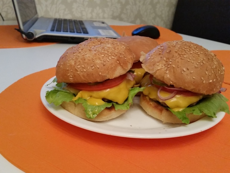 Еще примечание когда котлетки пожаряться лучше сыр класть на горячую котлету чтобы он слегка расплавился так вкуснее !!! И сразу можно собирать гамбургер чтобы котлетки сильно не остыли и сразу кушать ))) хотя уже и с остывшей котлетой муж уплетал )))
