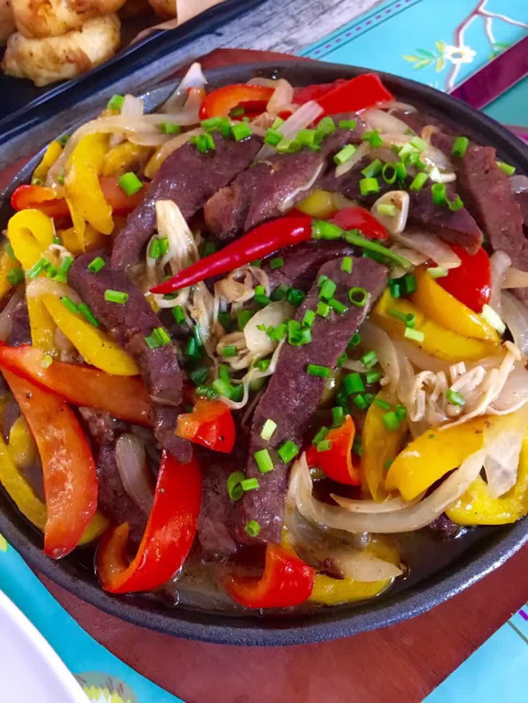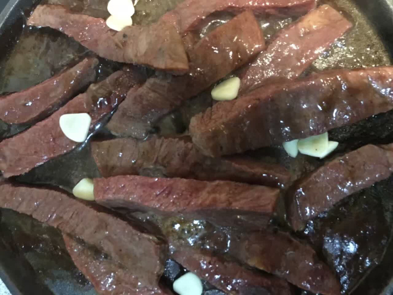 Мясо порезатьна полоски ок 1см толщиной. Посолить, поперчить, обвалять в крахмале. На чугунной сковородке в масле обжарить говядину.