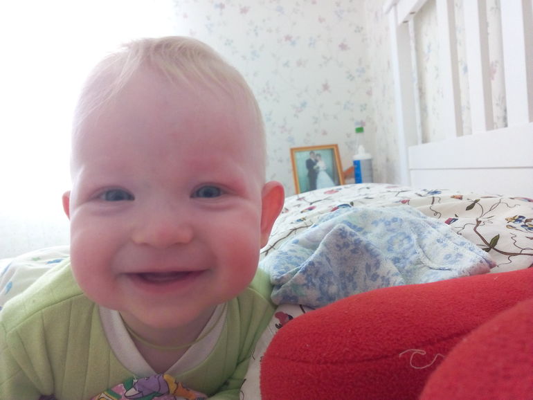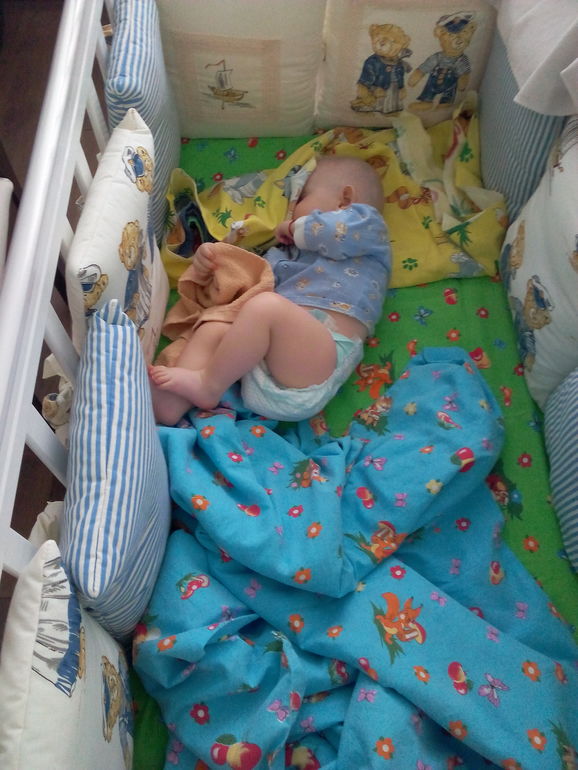 За этот месяц Платон научился уверенно сидеть, прямо держит спинку, а ещё быстро ползать по пластунски. Правда теперь он больше похож уже на гусеницу😁 Встаёт на четвереньки, раскачивается и снова на брюхо,продвигаясь вперёд. Зубов по прежнему нет. Сам ещё не садится. Купили мы Платохе кроватку с маятником, из колыбельки он вырос. Пробуем засыпать там. Происходит это примерно так: