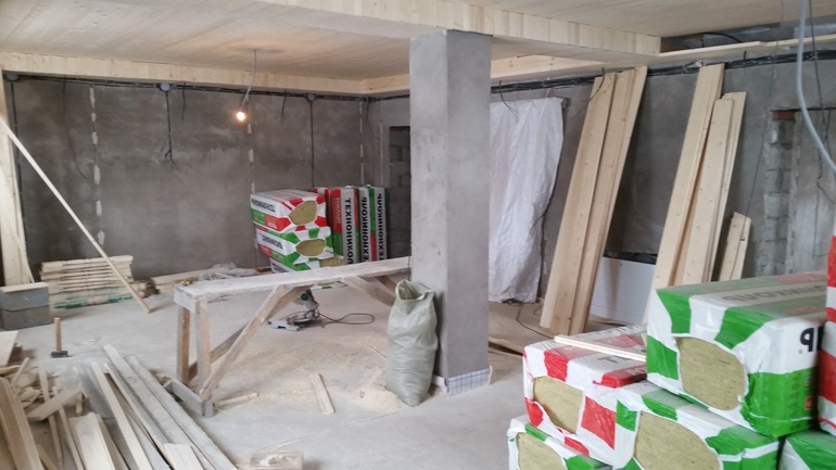 это лестница на 2й этаж она в левом верхнем углу комнаты. Потолок деревянный(шпунтовая доска). Размеры гостнинной 5600х9800