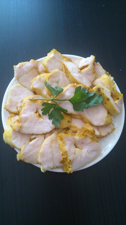 2 грудки замариновала в смеси специй (у меня перец, паприка, имбирь, чеснок и куркума) и соли. Плотно, стараясь избавится от воздуха, завернула в рукав для выпечки и еще упаковала в пакет с замочком (из Икеа).