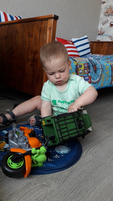 Что умеет: лихо ползать на четвереньках, вставать у любой опоры, правда чаще на носочки, сидит сам естественно.