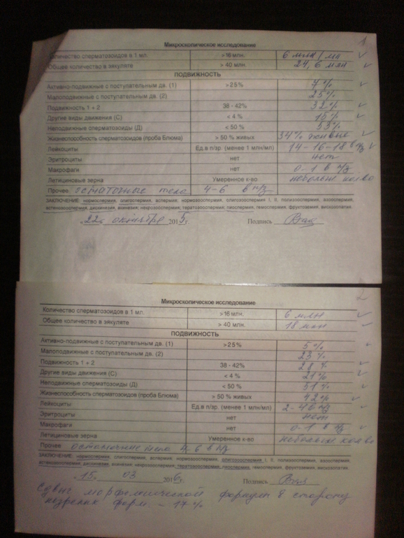 Стаж планирования 2 года в июне. В октябре 2015 сдали первый анализ спермы, в марте 2016 второй. Ниже прикладываю фото анализов № 1, № 2 . Извечный вопрос что делать? Можно ли естественно забеременеть?