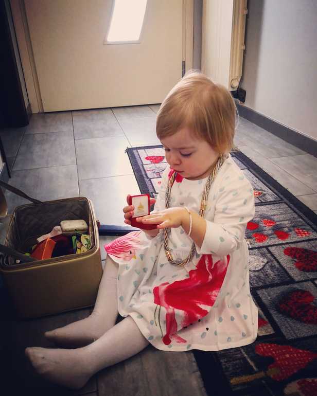 Очень любит всякие украшения, может долго сидеть и перебирать, примерять... Начала интересоваться моей косметикой. Теперь стараюсь краситься только без её присутствия и прятаю помады далеко. 😅😂