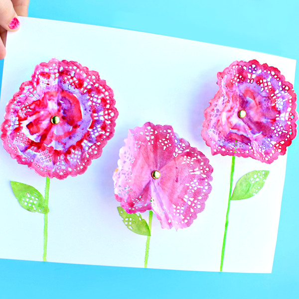 Создайте весеннее настроение, сделав с детьми яркую подделку из бумаги. Для аппликации вам понадобятся бумажные маленькие ажурные салфетки и брадсы, которые используется в скрапбукинге.