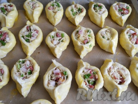 Руками сформировать открытые пирожки в виде лодочек. Выложить на противень, застеленный пергаментом. Смазать бока пирожков желтком.