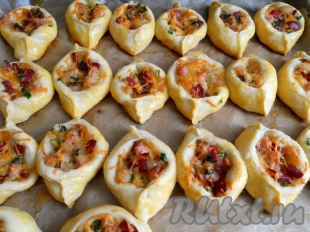 Выпекать пирожки с колбасой и сыром в разогретой до 180 градусов духовке до румяности (около 30 минут).