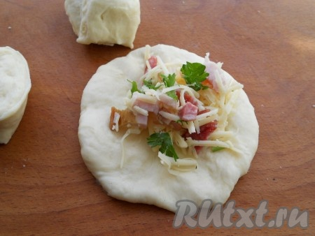 Тесто скатать в колбаску. Отрезать небольшие кусочки (20-30 грамм), приплюснуть в лепешки. В каждую - поместить щепотку начинки.