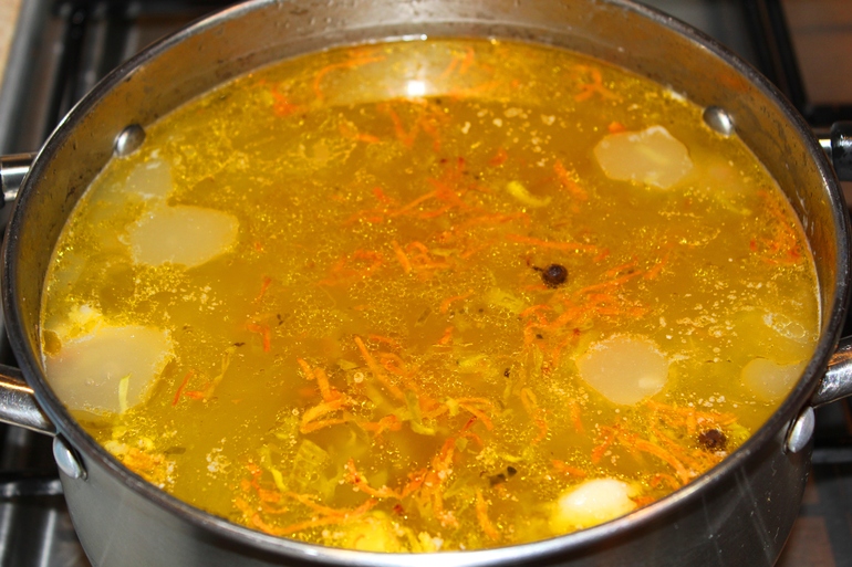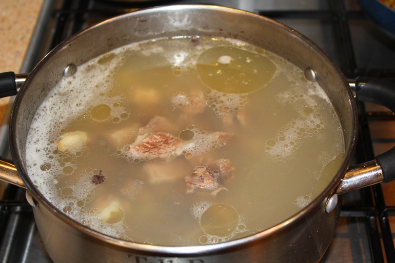 После того как бульон закипел, снимаем пенку, добавляем в кастрюлю черный перец горошком, варим 1.5 - 2 часа на слабом огне