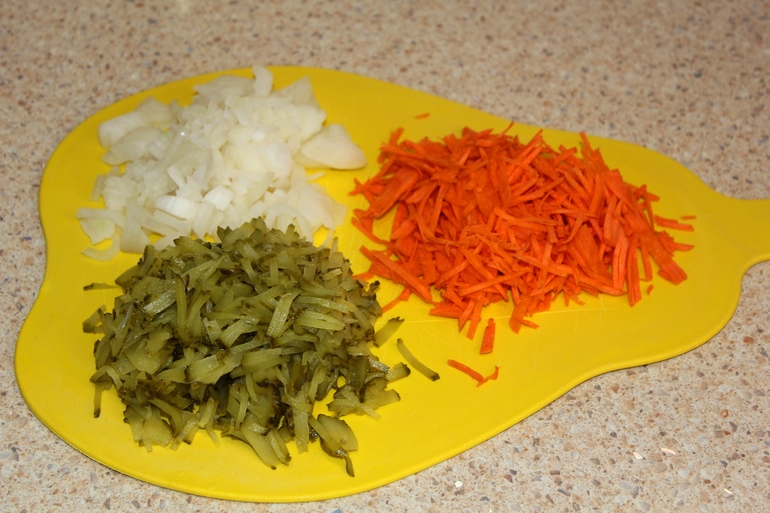 Подготавливаем овощи для пассеровки. Лук режем полукольцами, морковь и огурчики соломкой