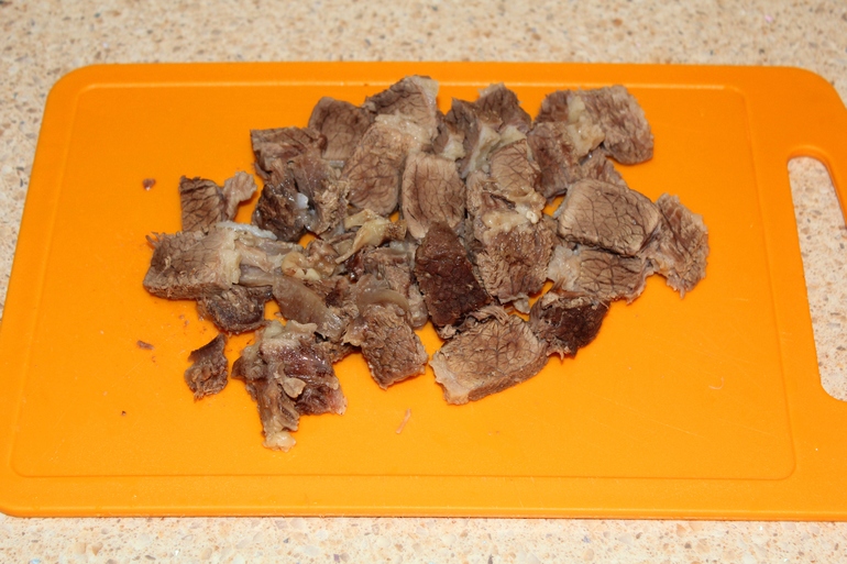 Достаем из кастрюли мясо, режем кубиками (кусочками), косточки удаляем