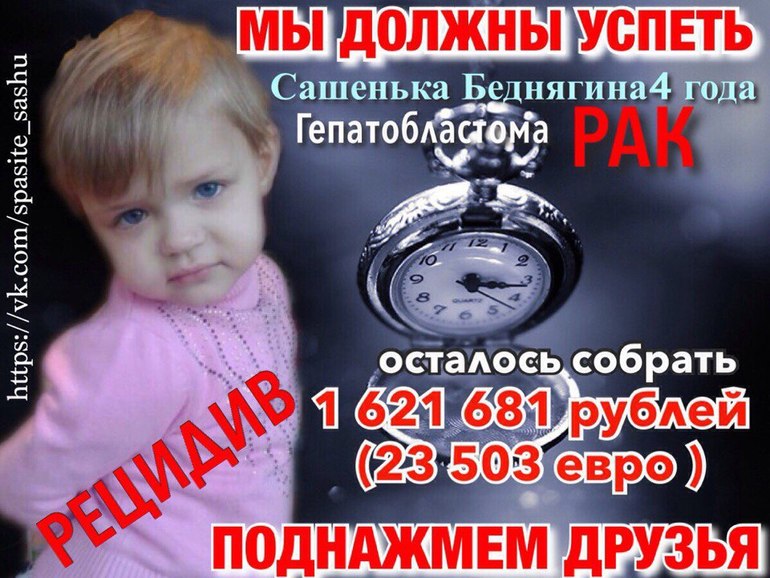 В Сашеном группе в контакте есть ВСЯ информация о ней, её семье, история болездить. Много видео и фото этого маленько солнышка, которая вот уже 2 года из своих 4х так борется за жизнь!@!