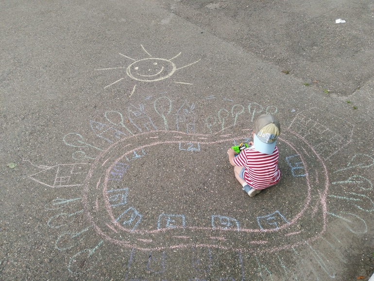 - Рисуем на асфальте дома, дорогу, остановки, а ребенок катает по дороге машины. Можно пронумеровать остановки и давать задание на какую остановку кого нужно отвести.