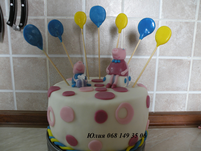 Фото получилось темноватым, но у меня было буквально пару минут на съемку, так как клиенты решили раньше забрать свой тортик:) Внутри - белый бисквит, клубничный мусс и банановый мусс.