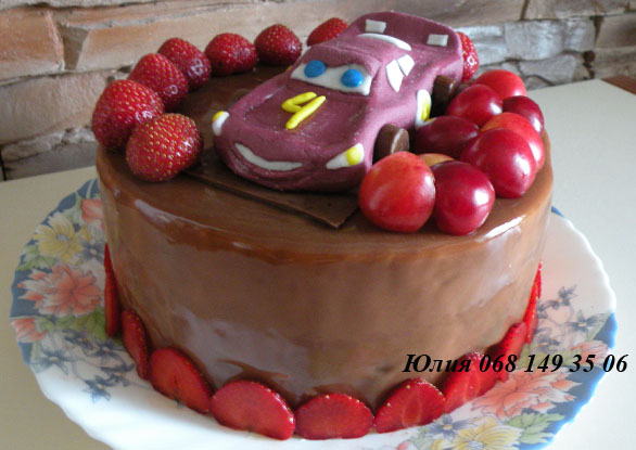 Летний тортик с пломбирным муссом, свежей клубникой и зеркальной глазурью из молочного шоколада на день рожденья маленького мужчины.