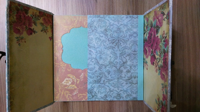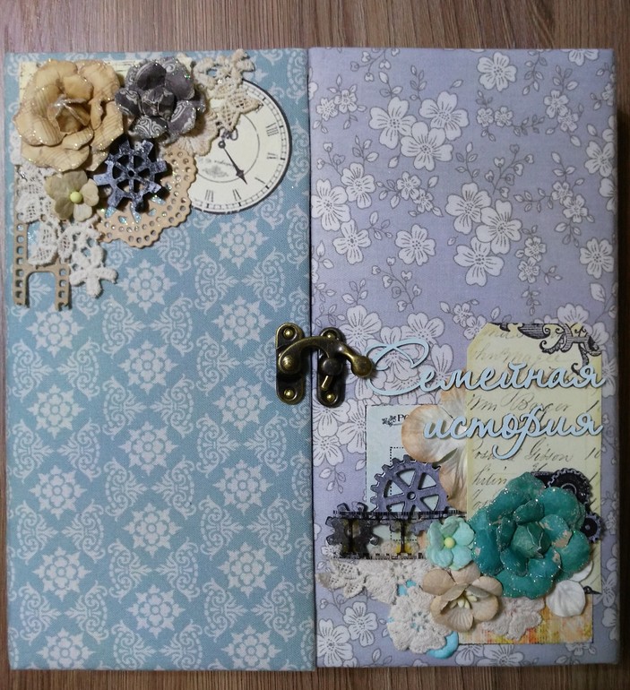 Этот альбом объединяет в себе сразу две истории. В альбоме два переплета со страничками, которые раскрываются последовательно одна за другой. Первые странички для фото самых старших поколений (справа одна семья, слева вторая). Каждая следующая страничка предназначена для фотографий новых поколений и последняя страничка общая, для фотографии семьи, объединяющей две фамилии, два рода.