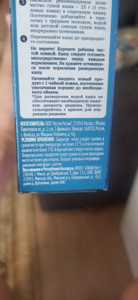 Ну так вот. Разводится кашка легко, без комочков, как некоторые другие каши. Без сахара, молока, пальмового масла. Нет подсластителя, а ведь часто встречается в других фирмах! Для меня, для первого прикорма это слишком.