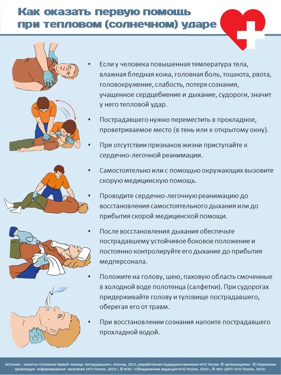 Положите на голову, шею, паховую область смоченные в холодной воде полотенца (салфетки). При судорогах придерживайте голову и туловище пострадавшего, оберегая его от травм.