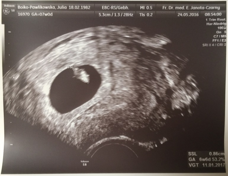 Сегодня закончилась 7-я неделя . Мне было очень-очень страшно идти к врачу, я так боялась, в голове кружились мысли "а вдруг опять нет эмбриона" , " а если нет сердечка" и т.д., но слава богу узи подтвердило ,что все у моего человечка есть : и сердечко, и тельце 😍😍😍 Мы уже целых 7 мм 😄 Я самая счастливая на свете 😊