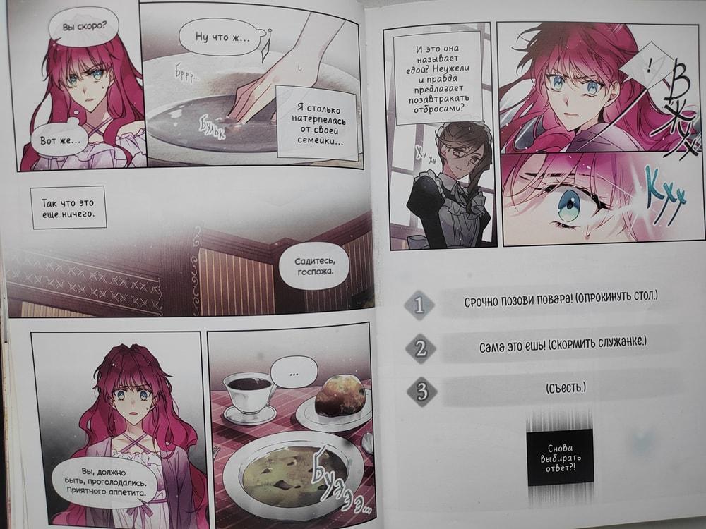 и завтрак с заплесневелой булочкой (видимо, отношения со слугами у Пенелопы тоже так себе). В игре предлагается 3 варианта действий или реплик:
