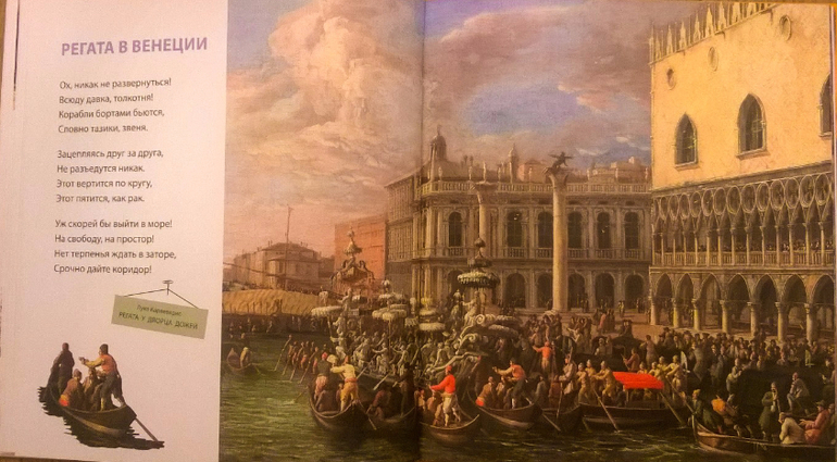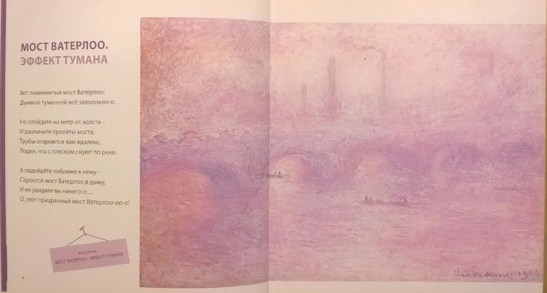 В разворот с "Мостом Ватерлоо" я теперь сама подолгу всматриваюсь, и мне кажется, эта книга стихов - отличный вариант для ребенка, чтобы и расширить кругозор, и познакомить с миром искусства, и обсудить многие вещи, и историю, и моду, и нравы. Книга очень долгоиграющая. Стихи это просто способ заинтересовать, привлечь самых маленьких.